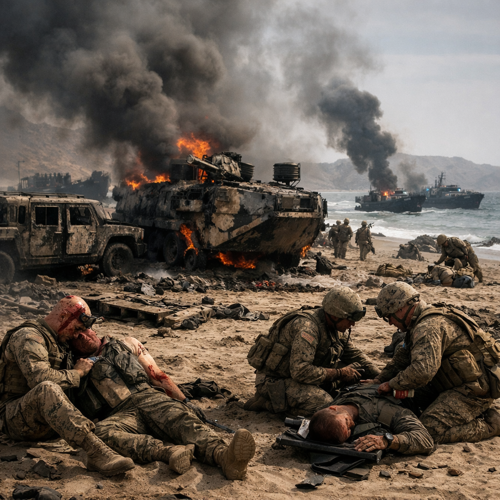 Presa rusă și canalele militare pro-iraniene susțin că trupele americane au debarcat pe coastele Iranului și că plajele sunt pline de vehicule americane carbonizate. Aceste relatări sunt însoțite de imagini satelitare și interceptări ale comunicațiilor militare, prezentate ca dovezi ale unui eșec american.