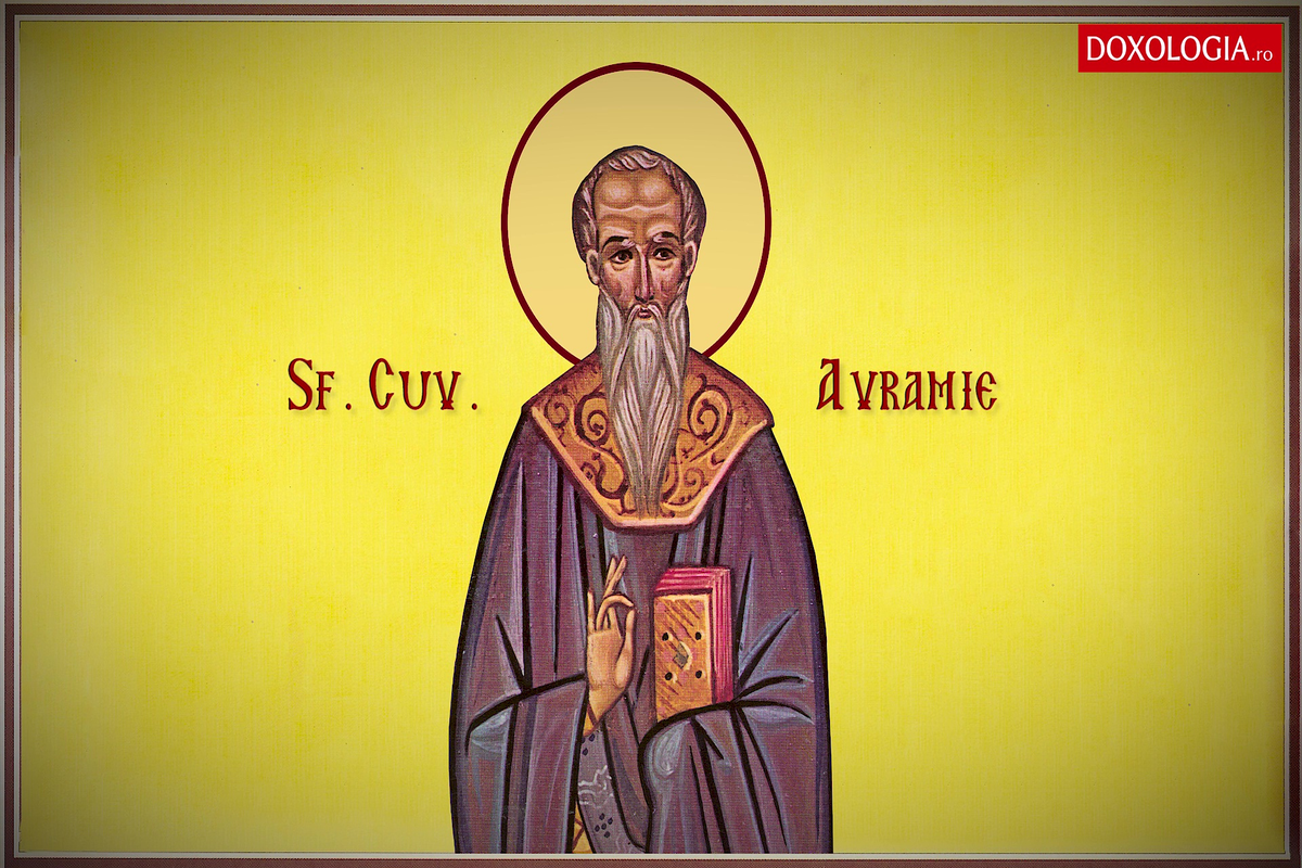 În trup ca un înger pe pământ te-ai arătat şi pustnicind, ai fost ca un pom răsădit, bine crescând lângă apa înfrânării şi cu curgerile lacrimilor tale spălând întinăciunea. Pentru aceasta te-ai arătat locaş Dumnezeiesc al Duhului, Sfinte Părinte Avramie.